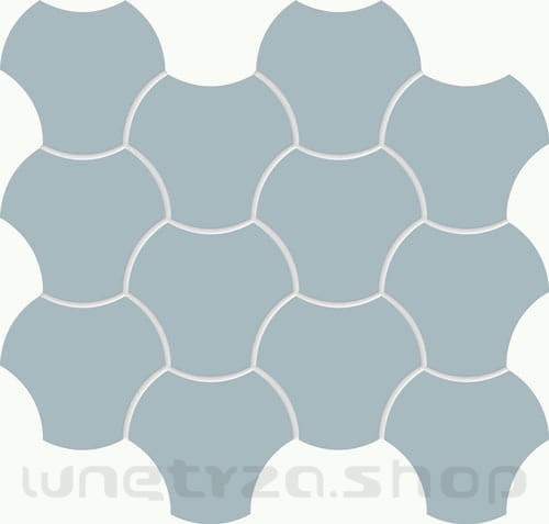 Kafle o geometrycznym wzorze przypominającym nieco rybią łuskę i pastelowym błękitnym kolorze. Cała kolekcja Cielo e Terra to płytki w stonowanej, pastelowej kolorystyce w różnych odcieniach i formatach. Mozaika stanowi jej uzupełnienie.