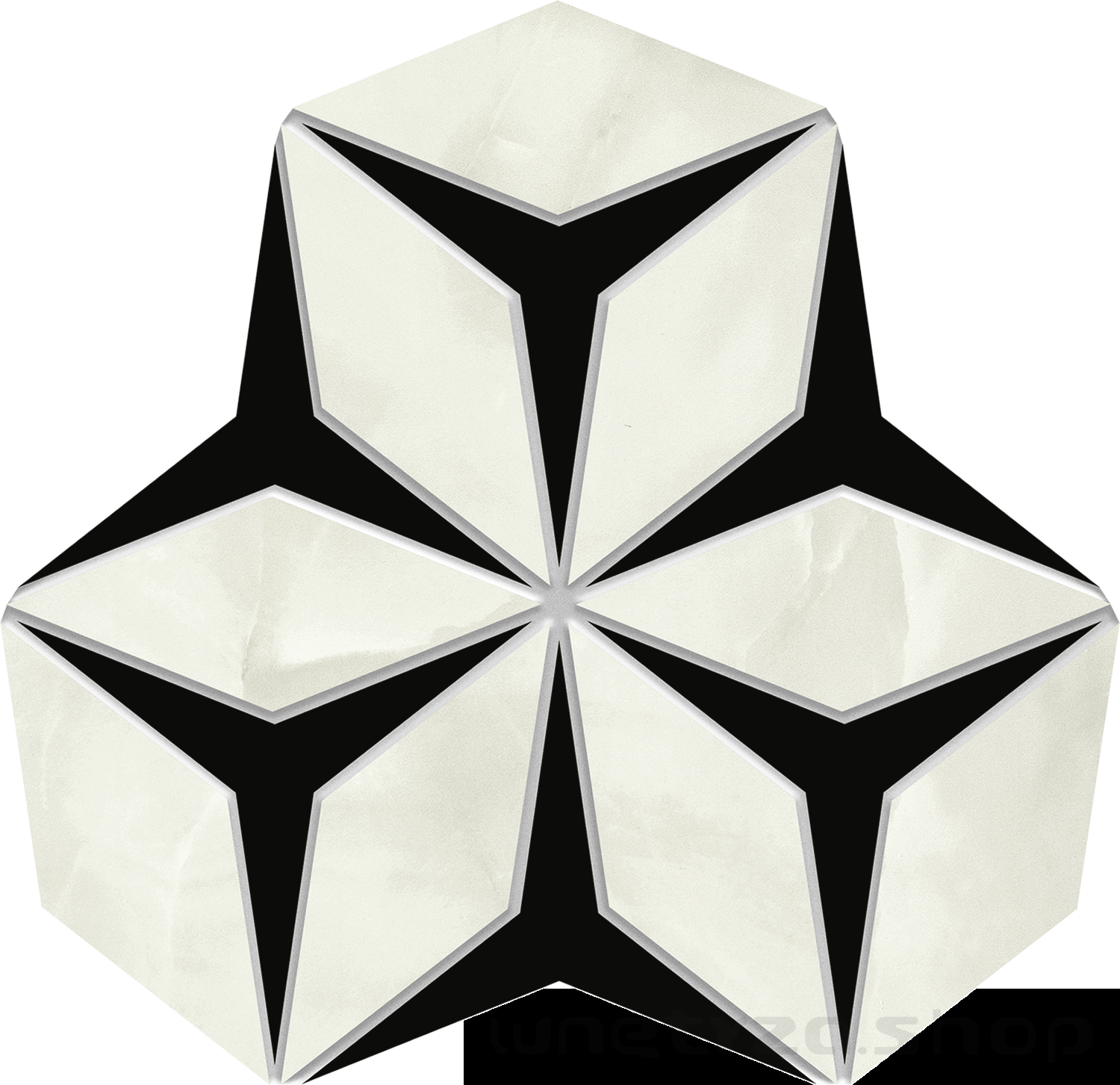 Mozaika ścienna w kształcie rozety. Geometryczny wzór, przypominający kwiat lub gwiazdę po położeniu na większej powierzchni nabiera zupełnie innego charakteru, tworząc przyciągający wzrok powtarzalny deseń. Użycie stonowanych kolorów, to jest czerni na tle kamiennego wzoru sprawia, że mozaika znajdzie zastosowanie w aranżacjach w różnych stylach.