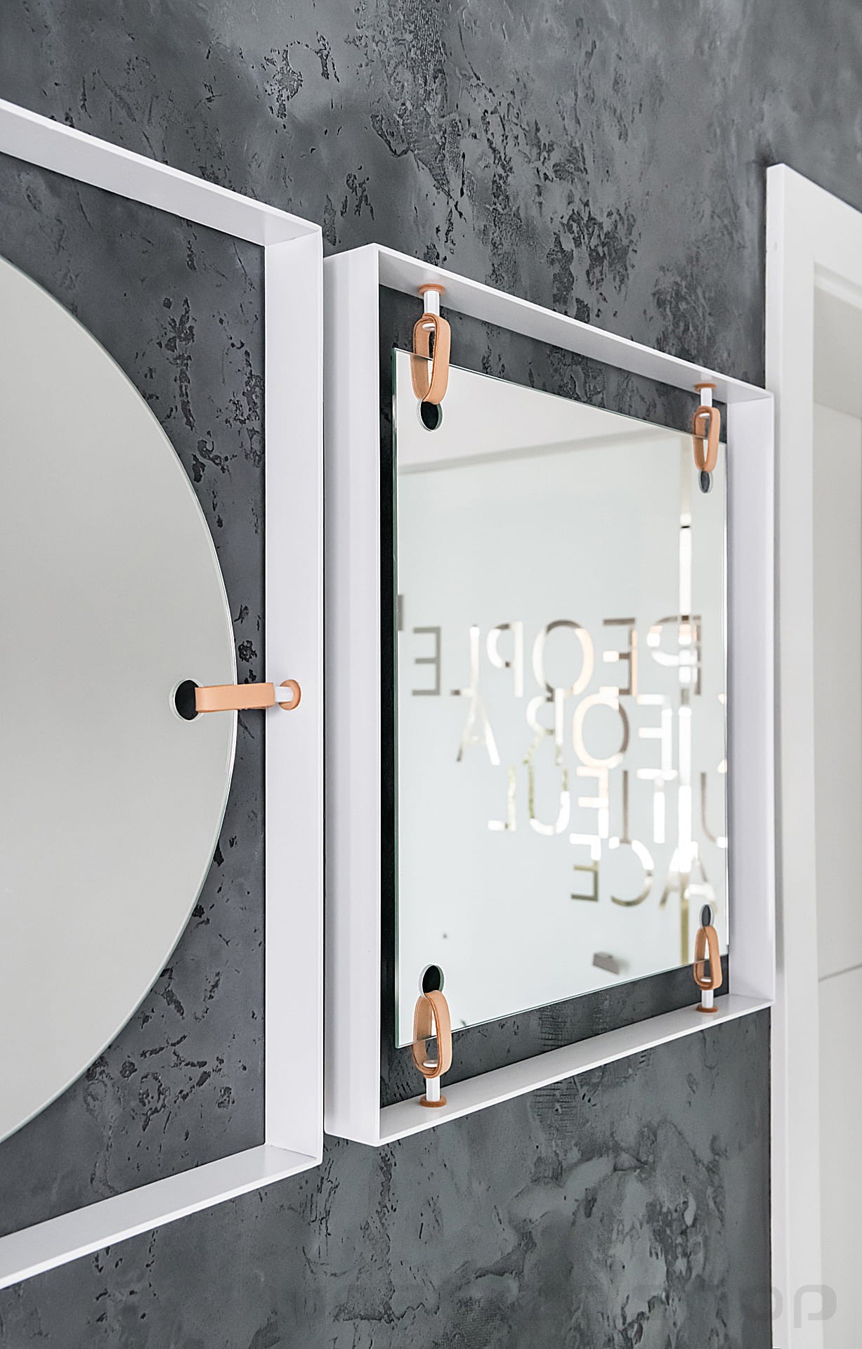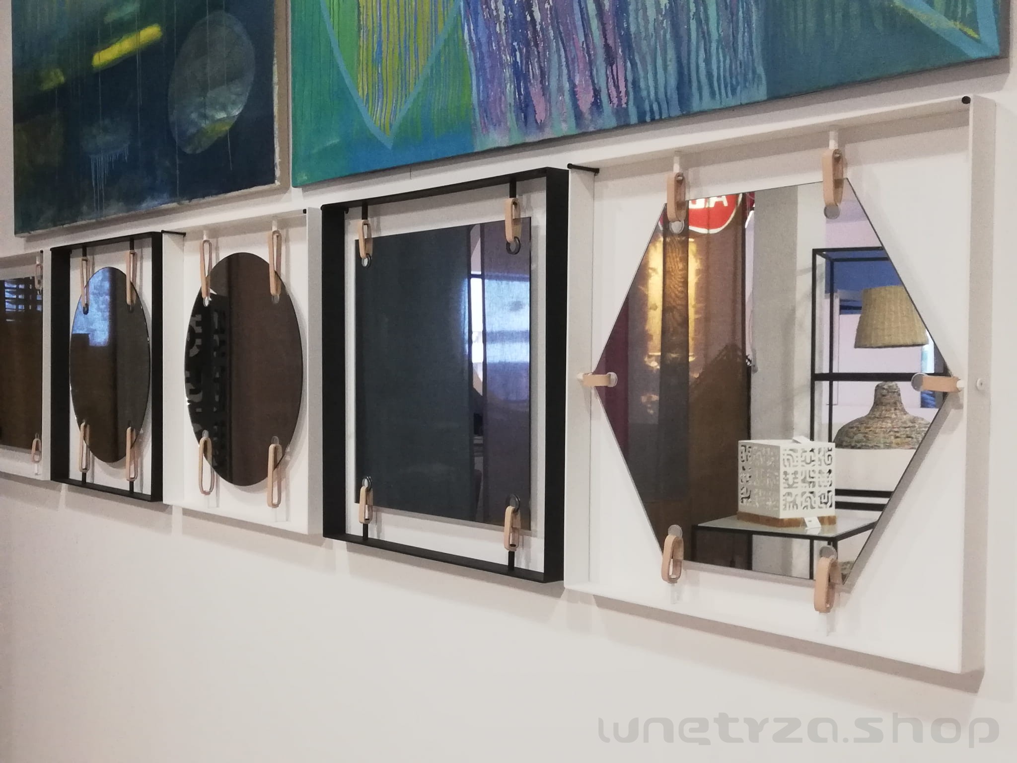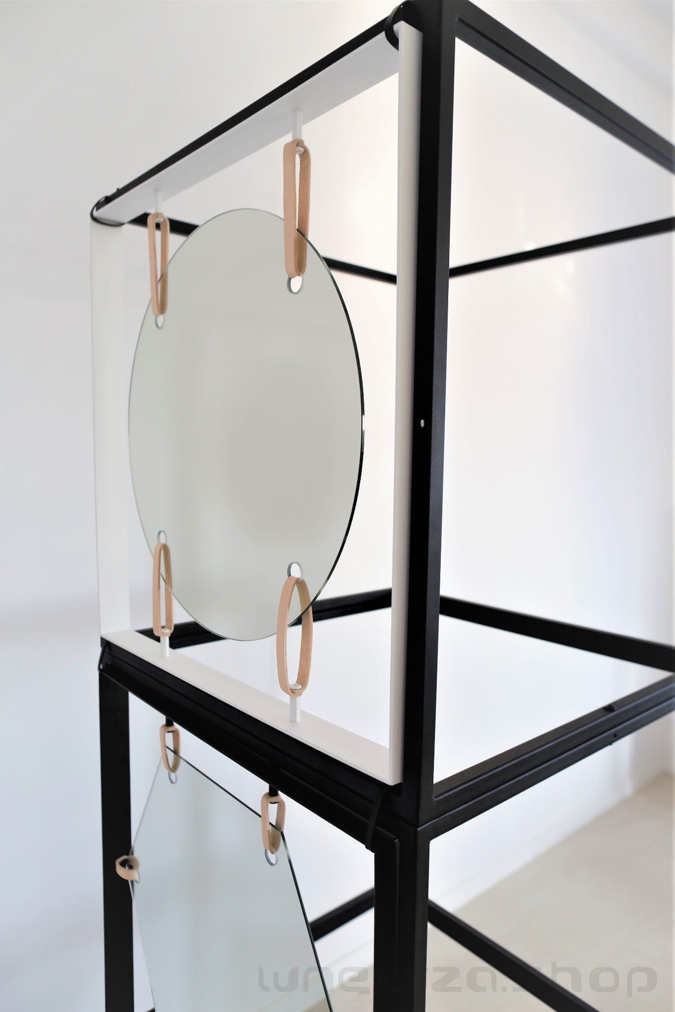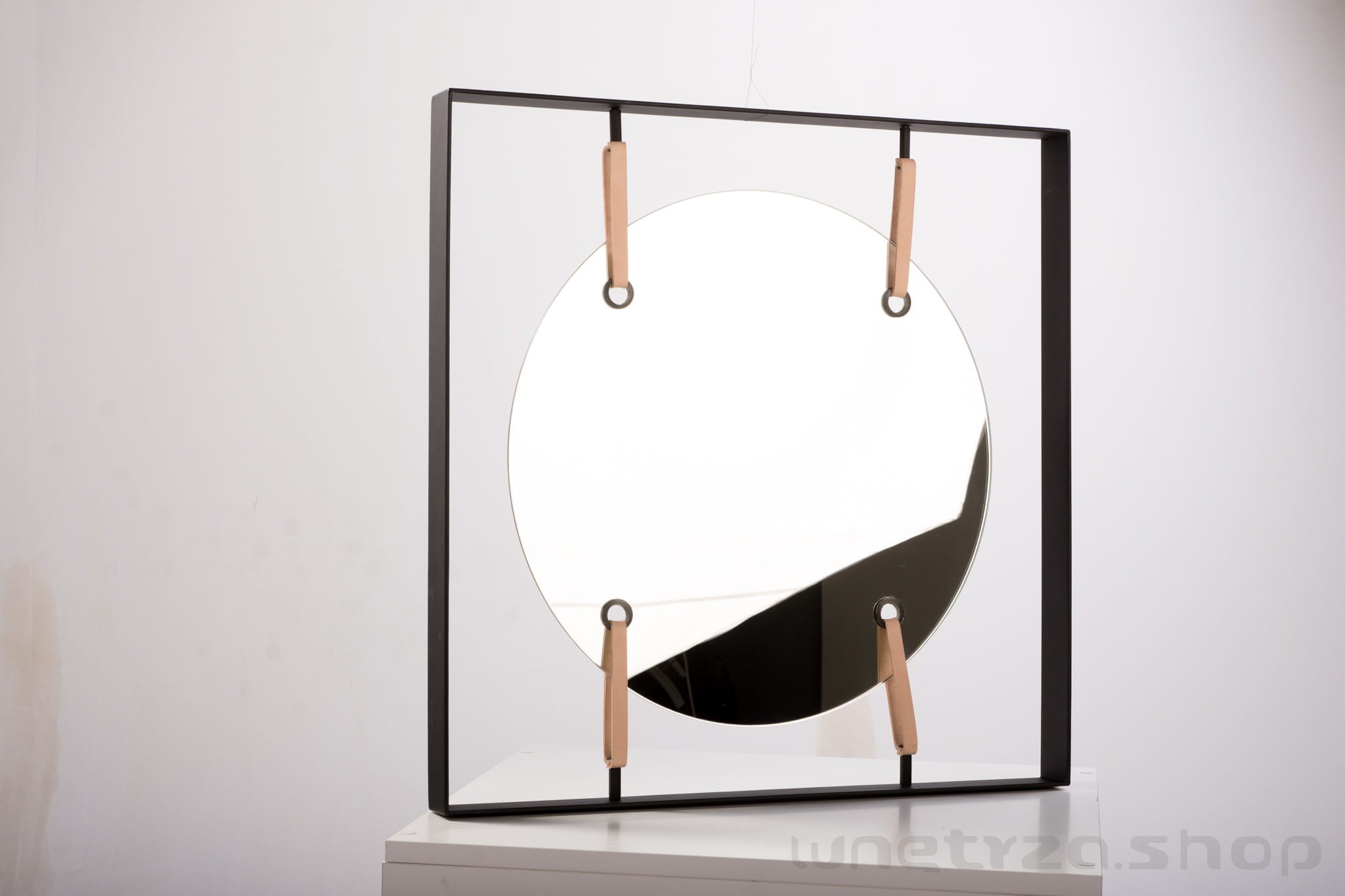 | Materiały | lustro, metal malowany proszkowo, skórzane naciągi |