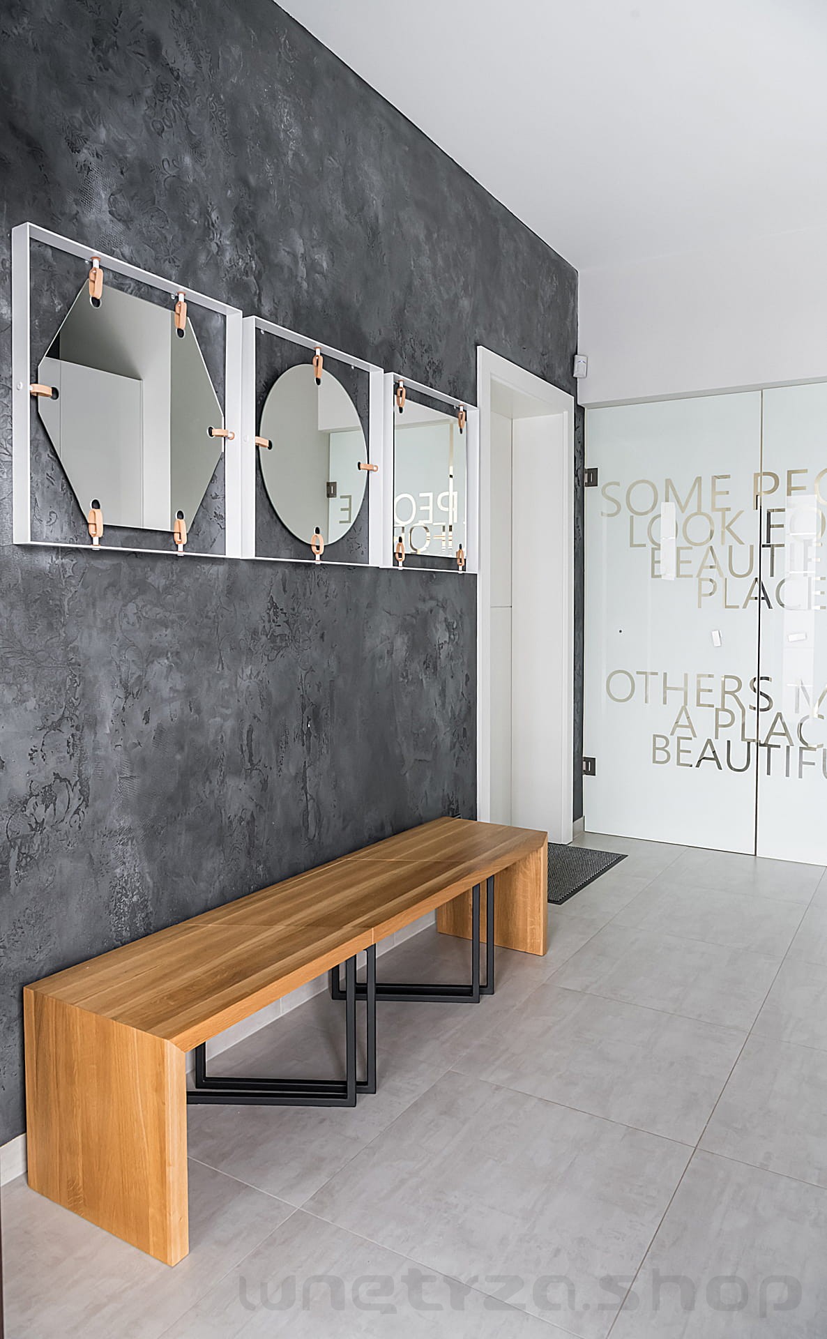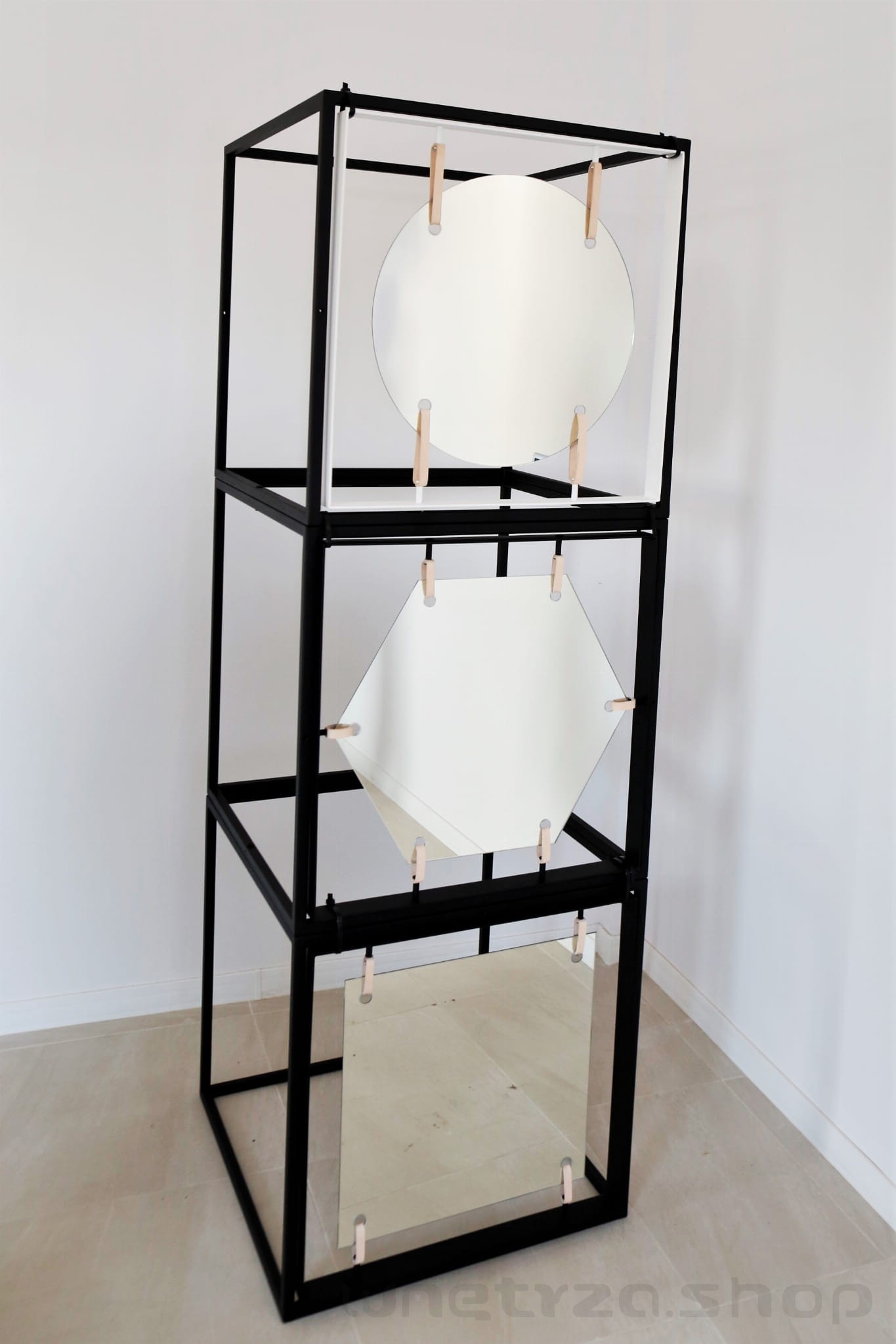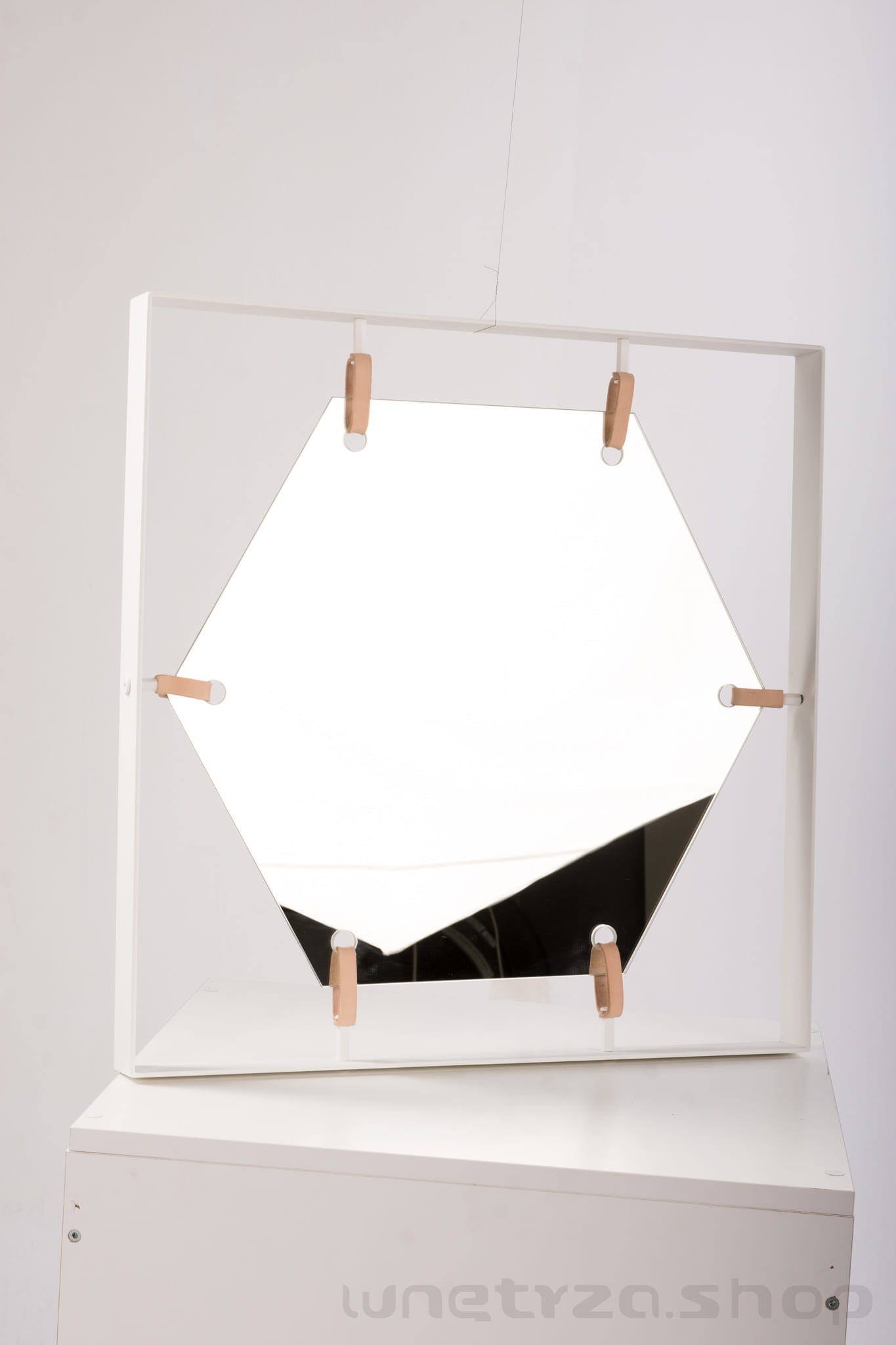 Kształt lustra do wyboru: sześciokąt, kwadrat, koło. Składając zamówienie prosimy o wpisanie w polu "uwagi" zamawianych kształt lustra i wybarwienia ramy (biel lub czerń).